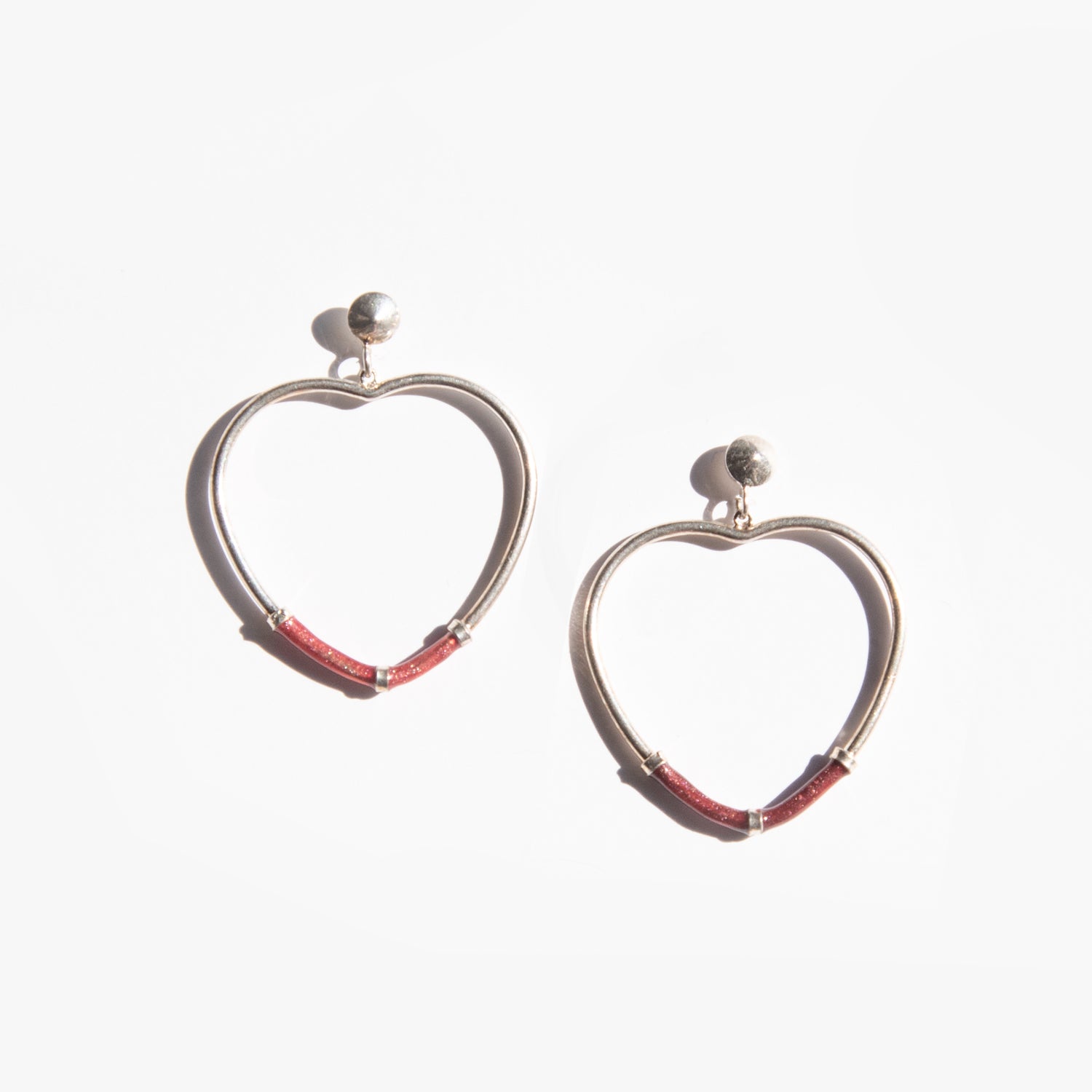 Sterling silver heart shaped earrings with red enamel detail.