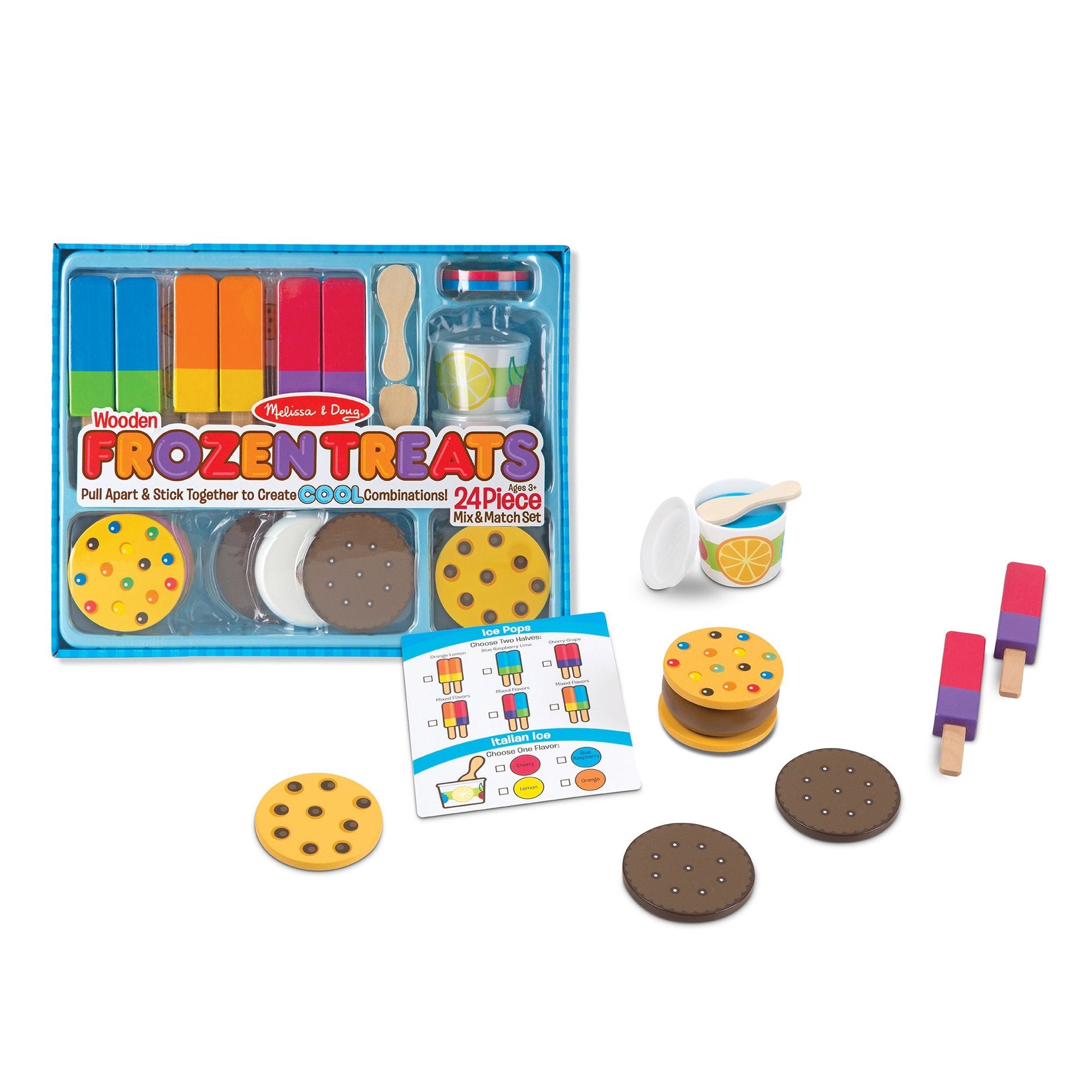 Chill out with this 24-piece mix-and-match set! Make wooden ice cream sandwiches, ice pops, and Italian ice cups. Self-stick tabs hold together three different cookie flavors and vanilla, chocolate, and strawberry ice cream fillings. There are six mult