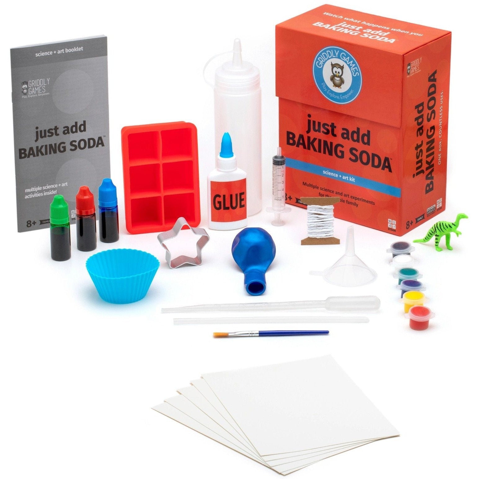 Just Add Baking Soda makes science and art at home easy by using supplies you already have. This kit comes loaded with everything you need for at-home science and art experiments, all you need to do is add the missing ingredient. Future scientists and artists agree that this kit is explosive! More than 20 science and art activities including Bath Bombs, Ornaments, Baking Soda Volcano and so much more! Discover chemical reactions, states of matter, and alkaline. This kit features instructions in English, Spanish and French. Designed for kids ages 8 and up.