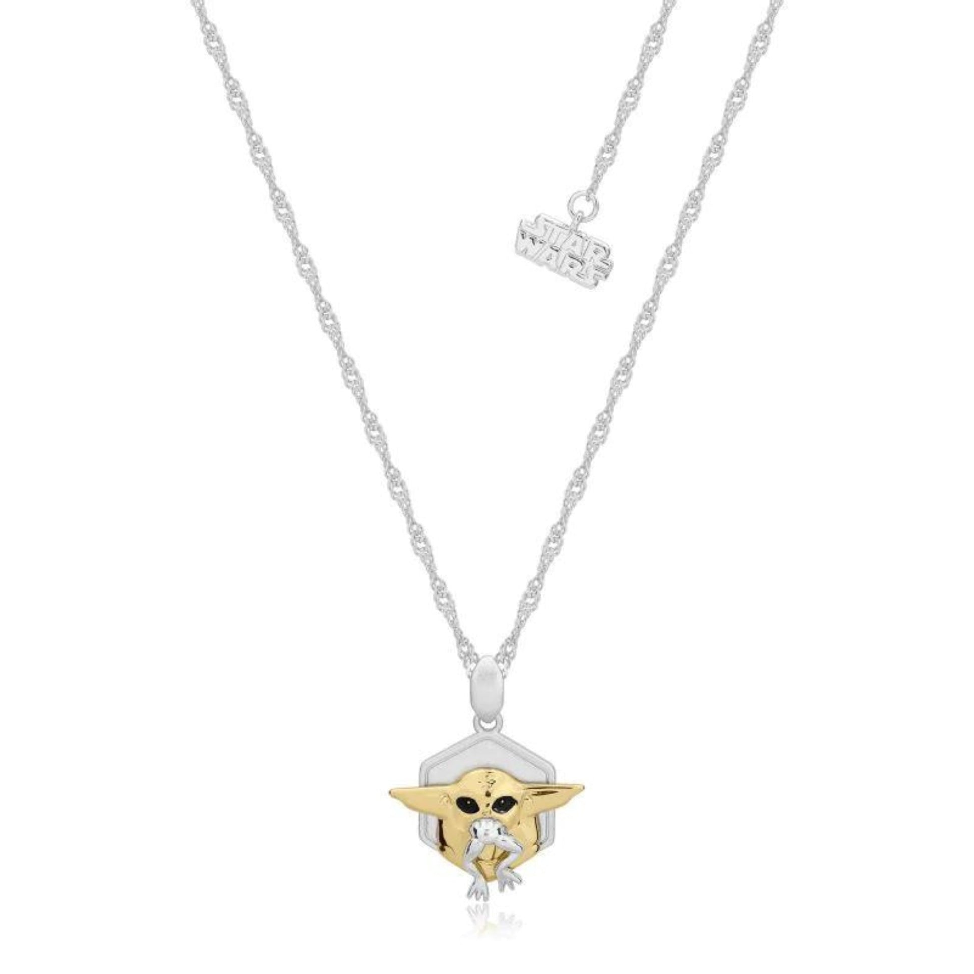 Crafted with precision and care, this necklace boasts a delightful pendant featuring the beloved character Grogu, also known as "Baby Yoda," enjoying a tasty snack. With its intricate detailing and two-tone finish, this pendant is sure to capture the heart of any Star Wars fan and spark joy in anyone who sees it.