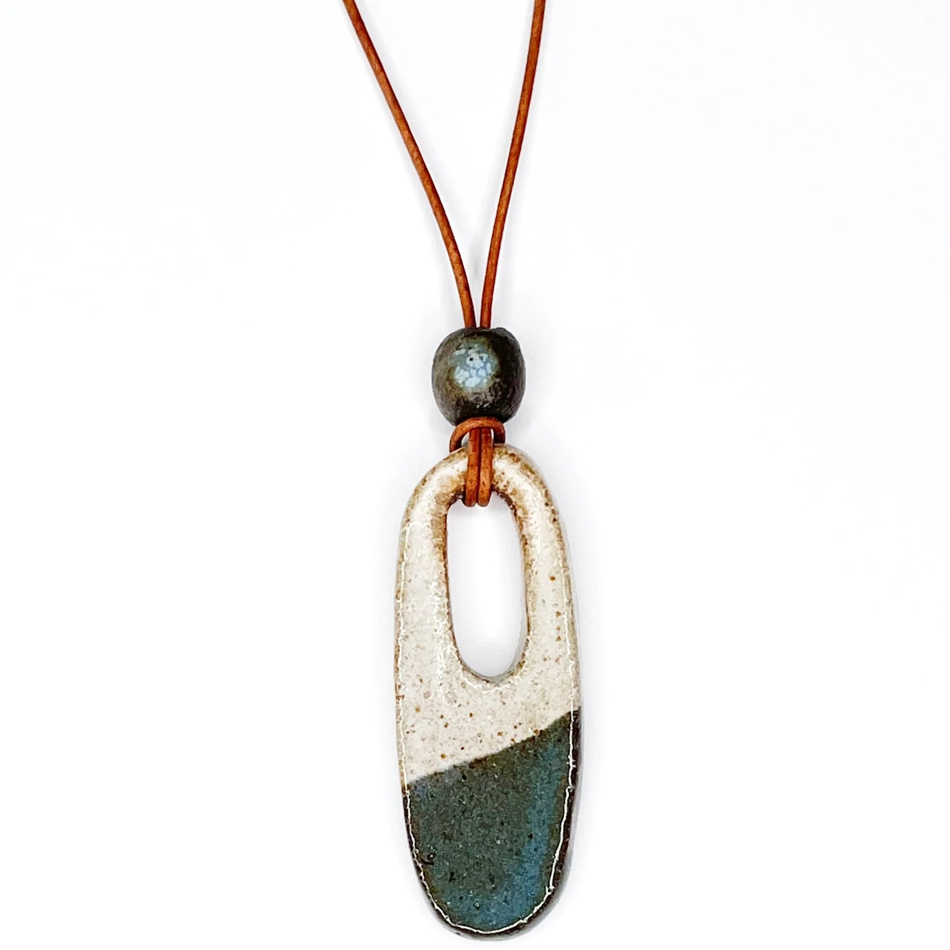Handmade ceramic pendant on a brown leather cord.