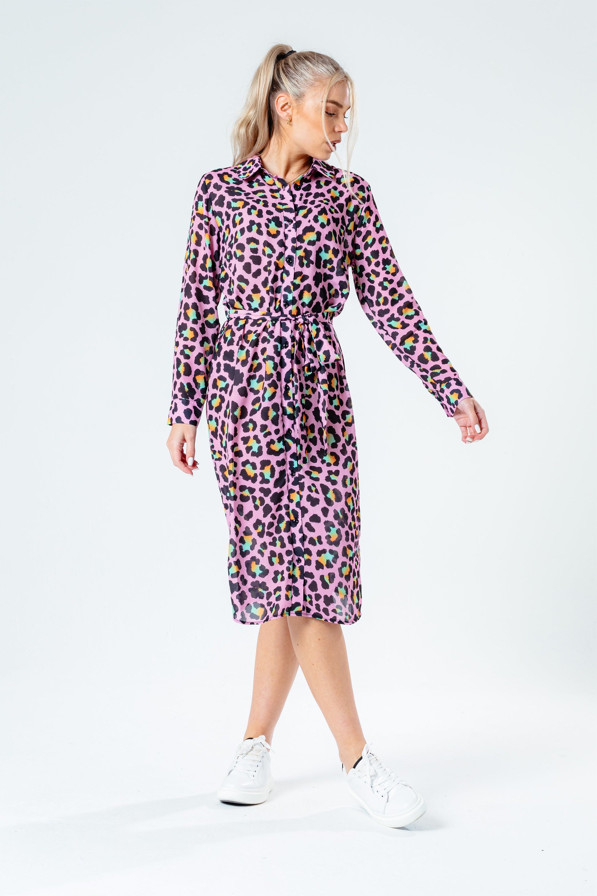 The HYPE. disco leopard shirt dress features a dusty pink and colour palette with a neon injection. Designed in a poly fabric base for the ultimate comfort and breathing space in our women's shirt dress shirt. With a fixed collar, button fastening and a waist tie in a leopard inspired print. Wear with chunky trainers and sunnies to complete the look. Machine washable.