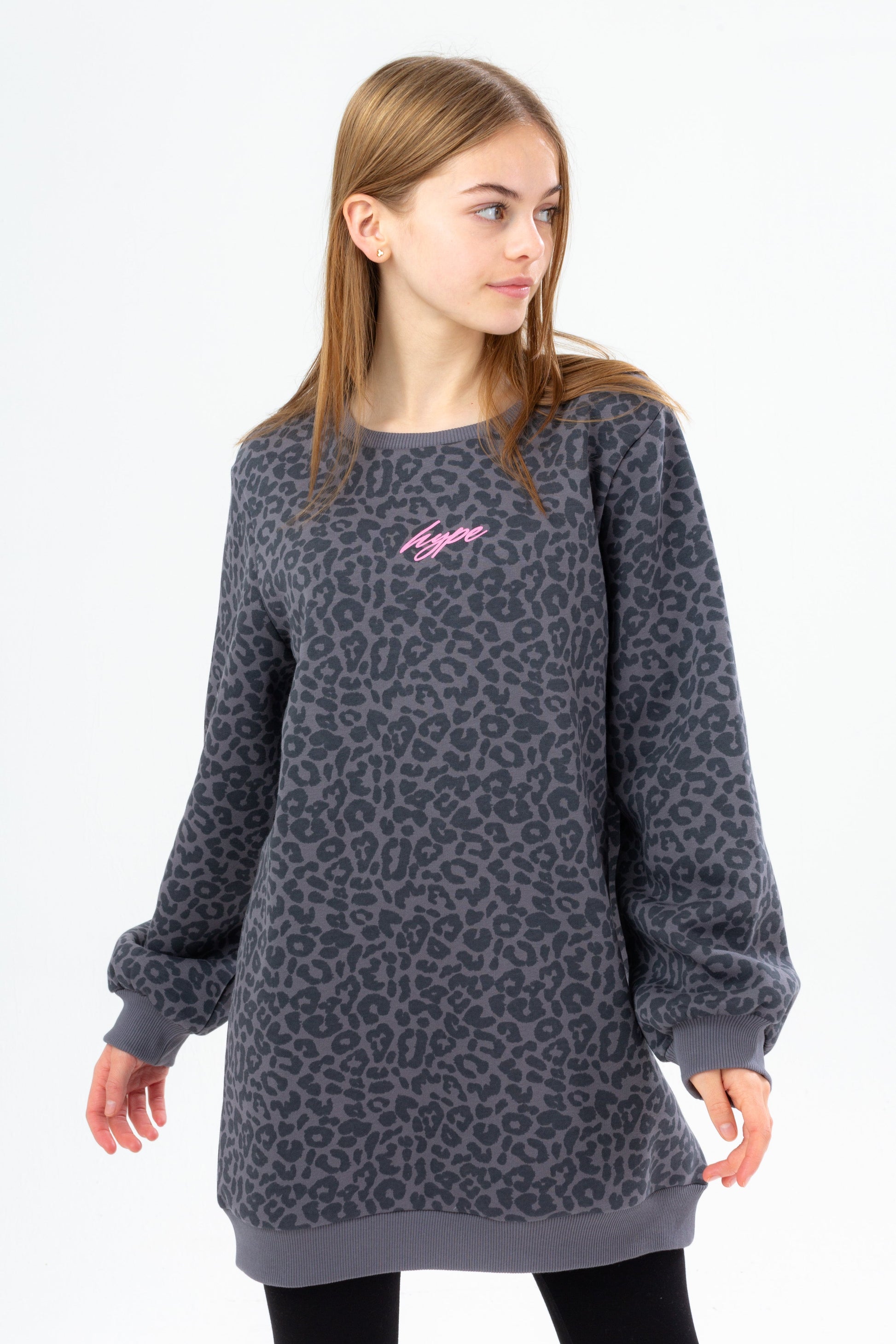 The cutest dress you'll need this season, and every season after that. The HYPE. Girls Charcoal Leopard Balloon Sleeve Crew Dress is designed in our standard kids crew dress shape, with a crew neckline and long sleeves in a soft touch fabric base for the ultimate comfort. Featuring an all-over charcoal leopard print and finished with the HYPE. scribble logo. Machine wash at 30 degrees.