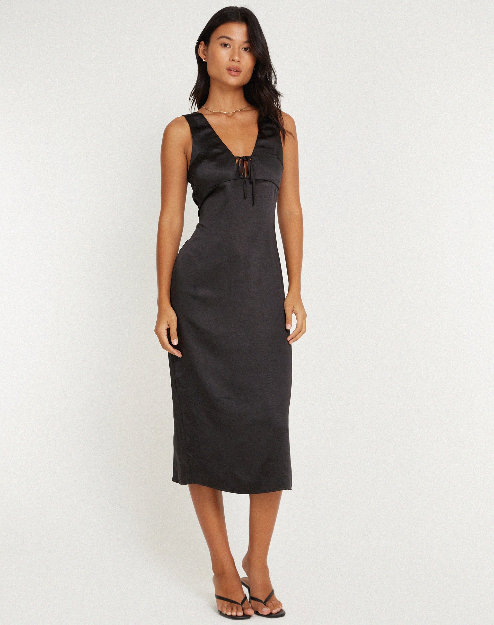 Your go-to occasion dress. The Lasanda features a midi, a-line fit with a plunge neckline and tie up detailing. For the ultimate cool gal look, we love to pair ours with some chunky white trainers.