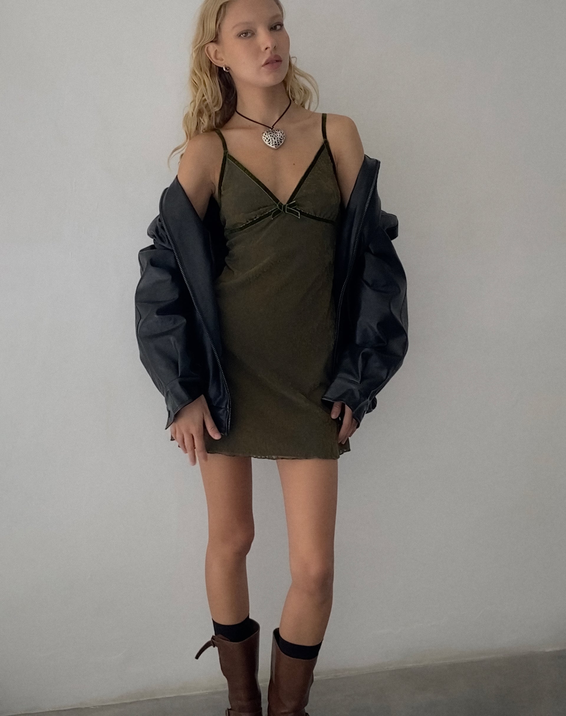 Introducing Mevila, the perfect dress for this season. In a dark olive flocked mesh this mini dress features thin cami straps with a V neckline. Finished with lettuce hem and decorative bow at the front.
