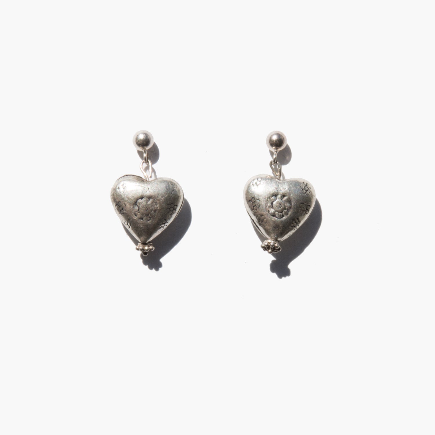 Handmade sterling silver folk earrings with pretty etched hearts.