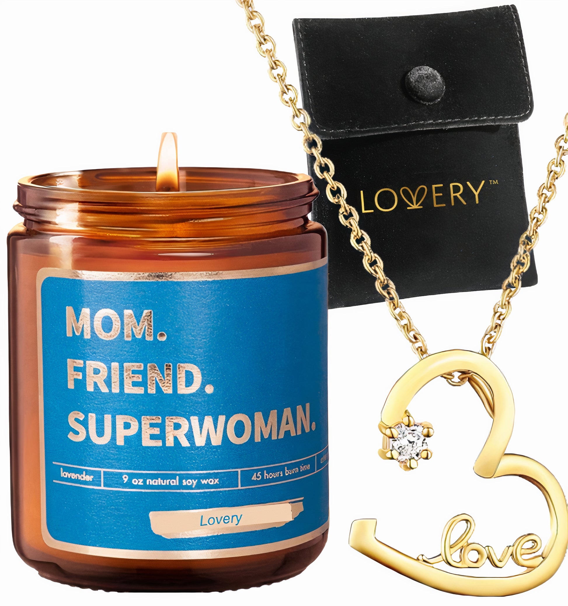 Mothers Day 14K Gold Plated Open Heart Pendant Love Necklace with Pouch & Lavender Soy Candle