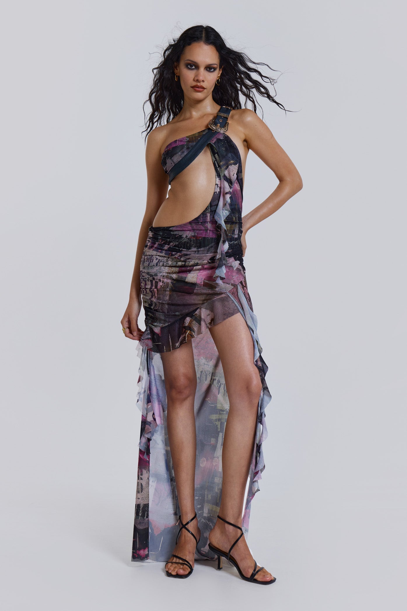 Introducing the Void Maxi Dress – Featuring a blend of frill detail, cut-out side and a functional PU belt with a western belt buckle. This maxi-length dress is crafted from a printed double-layer powermesh fabric.