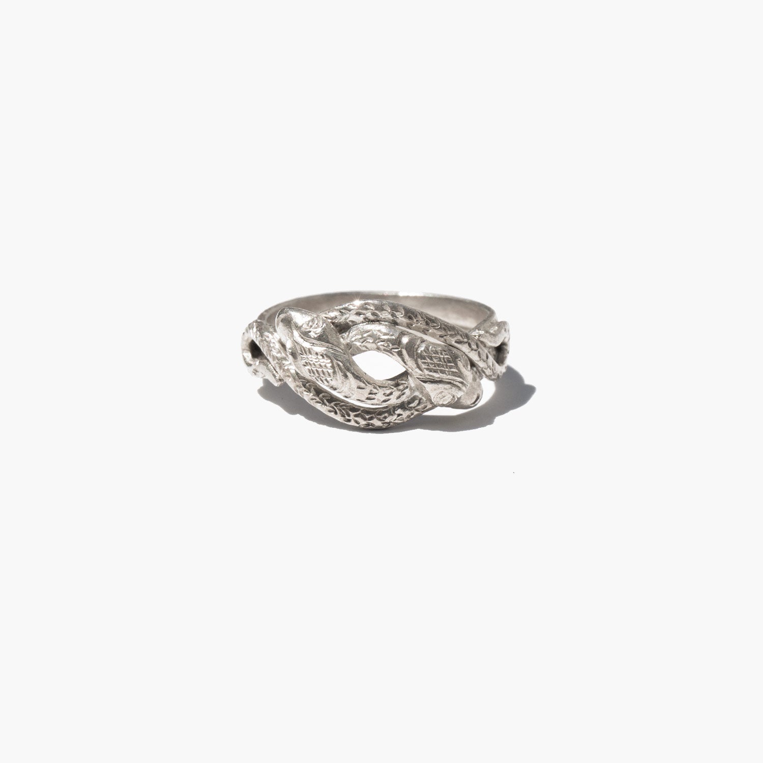 Intricately detailed sterling silver snake ring. For many centuries the snake has been a symbol of renewal and rebirth because of its own transformation through the shedding of its outer layer of skin. Others regard this powerful creature as a figure that represents protection and guardianship because when threatened, they tend to stand their ground and fight rather than retreat. Many ancient sites have used symbols of snakes at their entryways as symbolic defenders and having a snake talisman is a potent reminder of strength and courage in the face of fear and adversity.