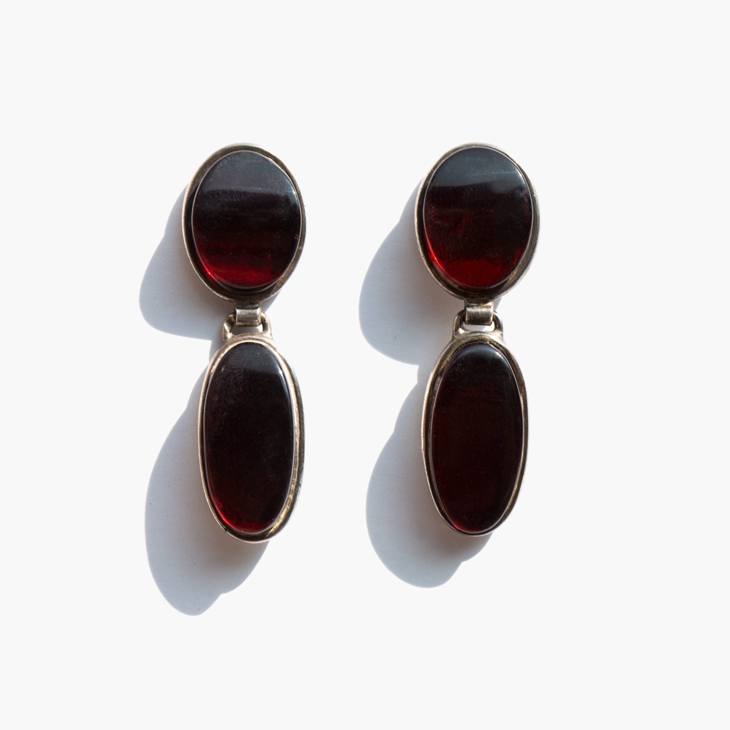 Exquisite deep red glass stone earrings in an articulated sterling silver setting.