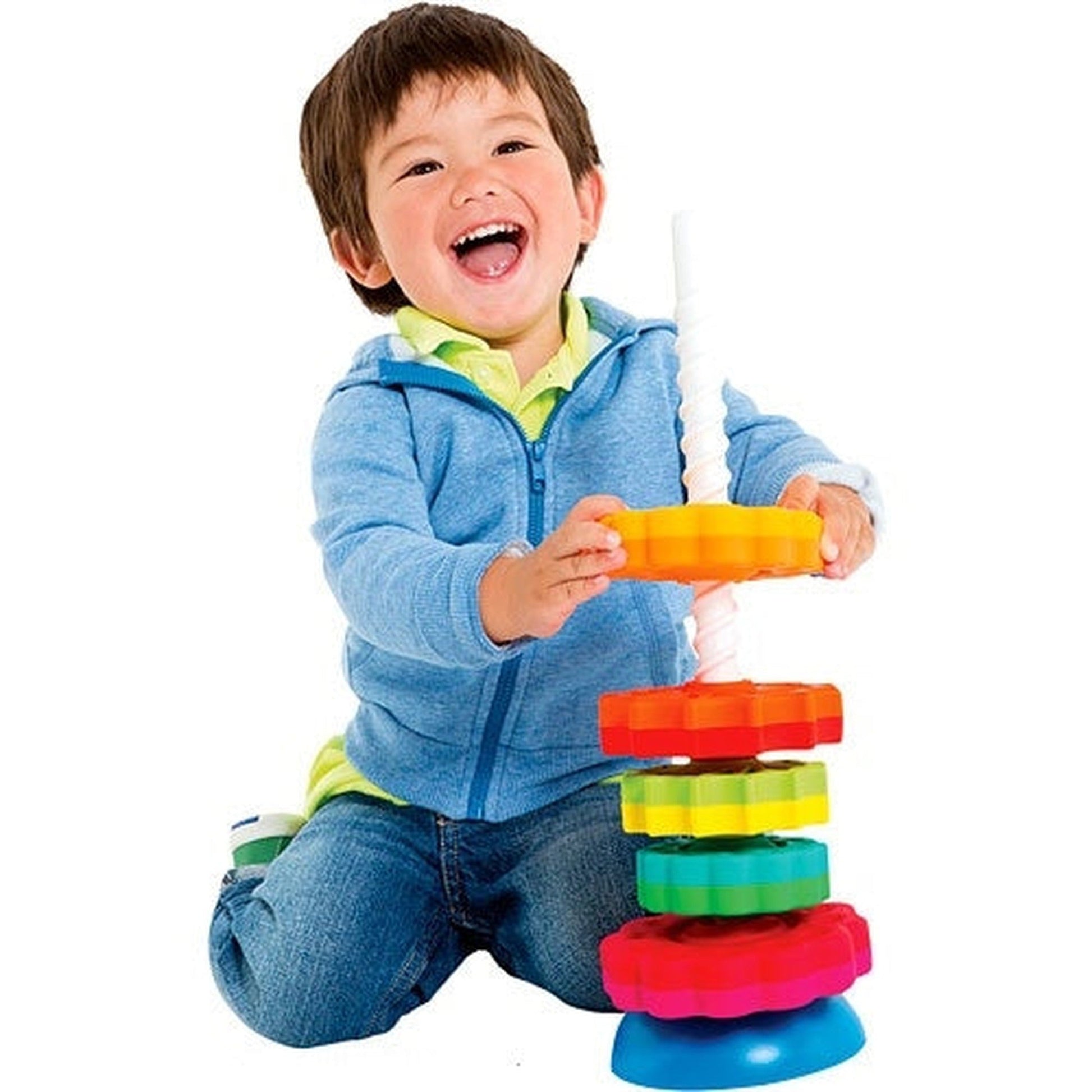 Drop the vibrant discs onto the threaded corkscrew pole and go ooooh as they spin fast and smooth to settle onto the reversible base.