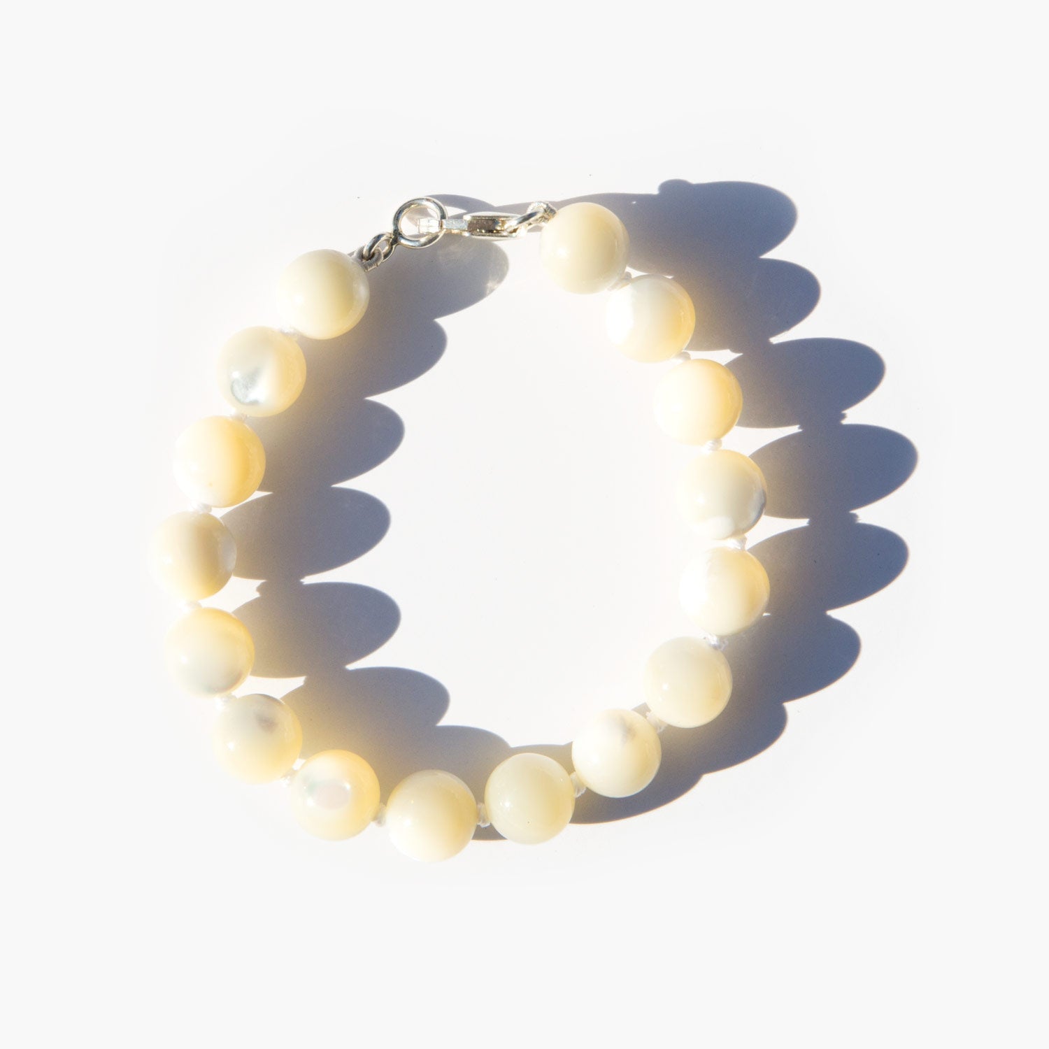 Bracelet of creamy mother of pearl beads with mottled iridescence and a sterling silver closure.